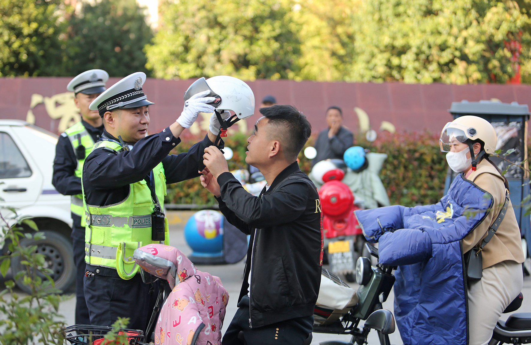 10月20日,陜西省渭南市區(qū)樂(lè)天大街中段,民警提醒市民佩戴好安全頭盔。連日來(lái),陜西省渭南市公安局交警支隊(duì)組織中心城區(qū)開(kāi)展“一盔一帶”專(zhuān)項(xiàng)整治行動(dòng)。民警采取“勸導(dǎo)+教育”的方式,對(duì)駕乘電動(dòng)自行車(chē)未佩戴安全頭盔群眾進(jìn)行查糾、勸導(dǎo),不斷提升市民安全出行意識(shí)。