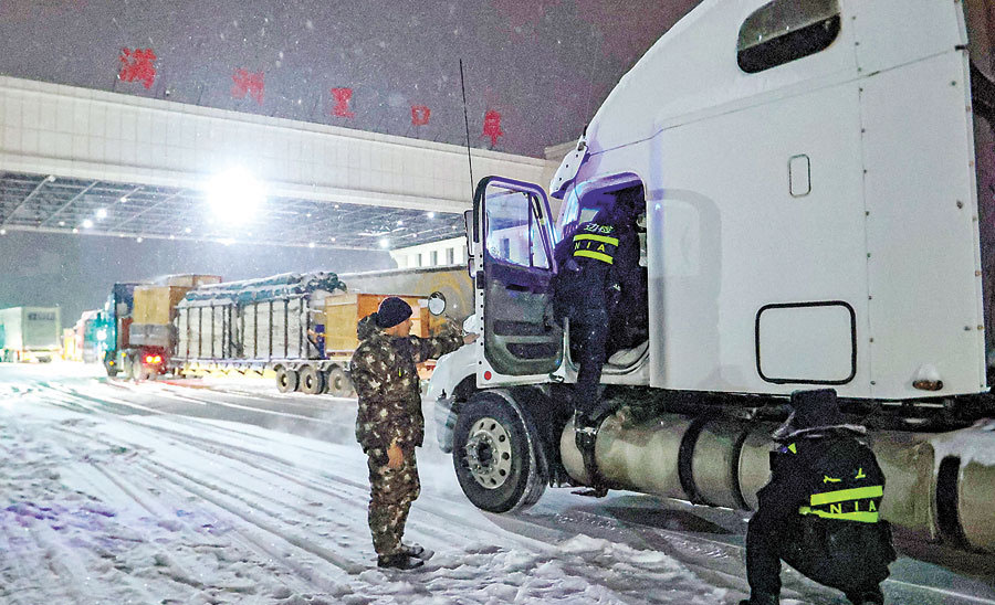 12月7日晚,內(nèi)蒙古自治區(qū)滿洲里市遭遇強(qiáng)降雪天氣,氣溫降至零下30攝氏度,滿洲里出入境邊防檢查站迅速啟動(dòng)應(yīng)急預(yù)案,加強(qiáng)口岸管控力度,強(qiáng)化重點(diǎn)區(qū)域巡查,確??诎锻P(guān)安全有序。(李發(fā)春)