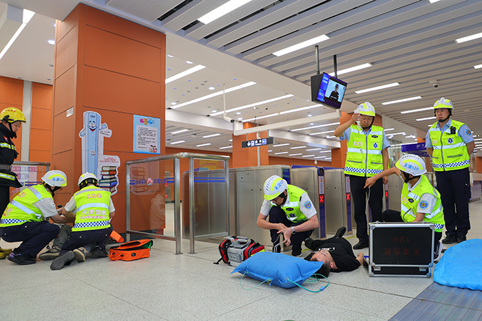 演練現(xiàn)場,模擬末端列車駕駛員室因電氣設(shè)備短路引發(fā)火情,使得列車迫停于區(qū)間,大量乘客受困于車廂內(nèi),同時因無法動車影響其他列車運(yùn)行,導(dǎo)致學(xué)苑北路站客流積壓的事件場景。演練過程組織嚴(yán)密、緊張有序,火災(zāi)警報(bào)觸發(fā)后,地鐵運(yùn)營工作人員快速到達(dá)受困車廂安撫“乘客”并就近實(shí)施疏散,在引導(dǎo)“乘客”逃生的同時時刻關(guān)注“乘客”身體狀況,及時開展救助救援和急救措施。車站內(nèi)軌道運(yùn)營企業(yè)先期處置、區(qū)級應(yīng)急力量參與、市指揮部指揮跨區(qū)應(yīng)急聯(lián)動,車站外市消防救援總隊(duì)、市衛(wèi)健委等市指揮部成員單位和區(qū)指揮部成員單位之間協(xié)同配合聯(lián)動處置,各級預(yù)案逐步啟動,各單位、部門及時響應(yīng),對預(yù)設(shè)場景應(yīng)急處置快速得當(dāng)。