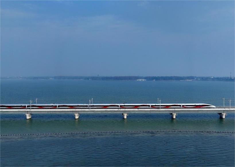 12月26日,列車駛過(guò)滬蘇湖高鐵元蕩湖段(無(wú)人機(jī)照片)。