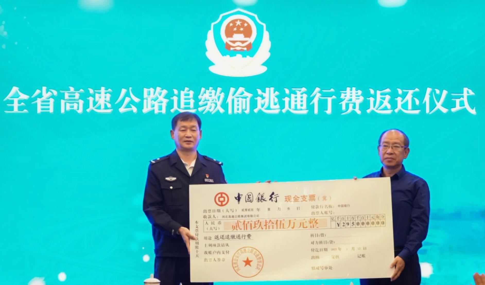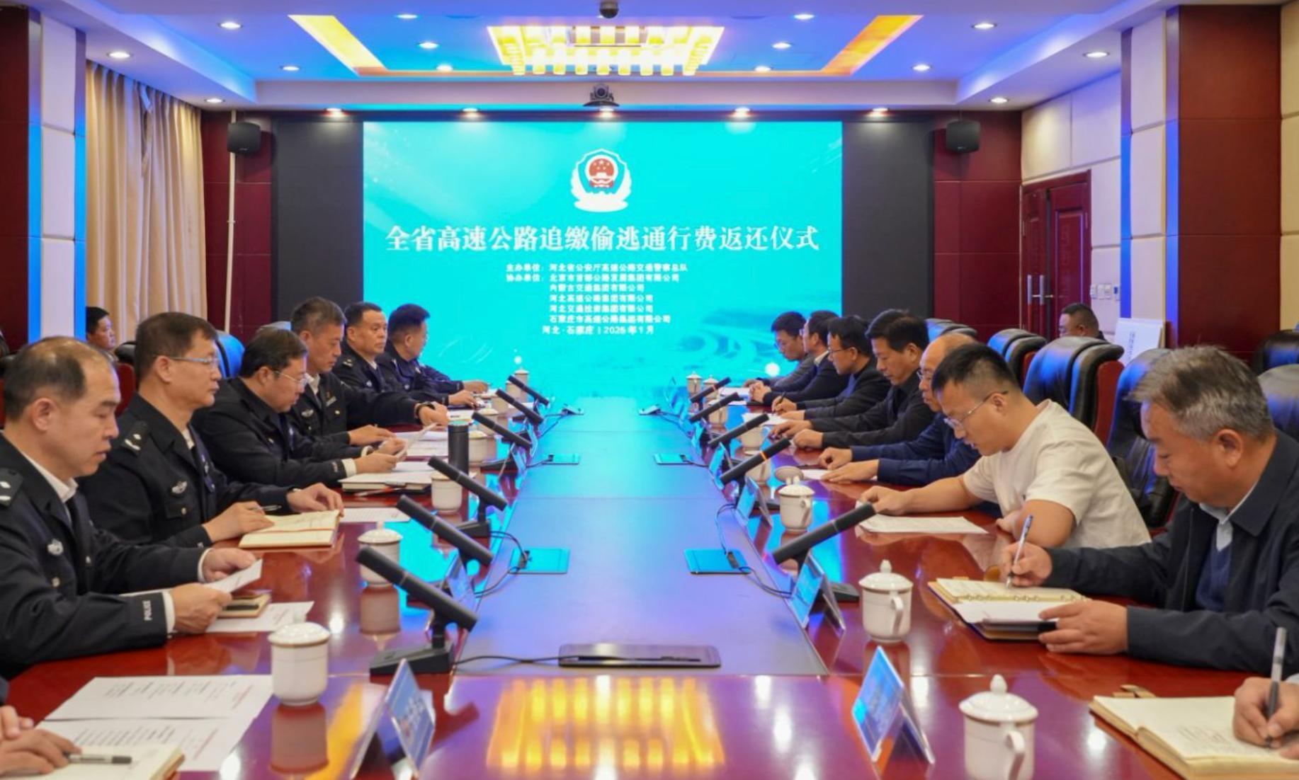 為集中展示高速交警依法刑事打擊涉交類違法犯罪專項行動成效,1月3日,河北省高速交警總隊舉辦全省高速公路追繳偷逃通行費返還儀式,向河北高速集團、河北交投集團、北京首發(fā)集團、內(nèi)蒙古交通集團、石家莊市高速集團5家業(yè)主單位返還追繳偷逃通行費550萬元。