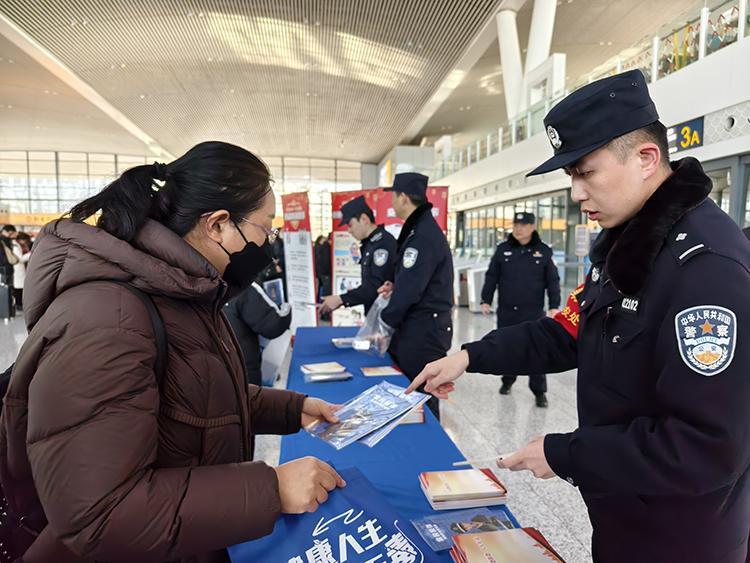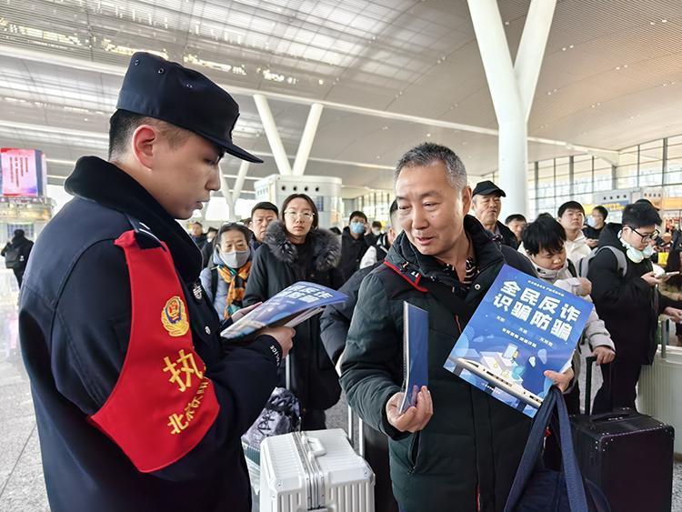 圖為民警在車站向旅客宣傳反詐常識(shí)。