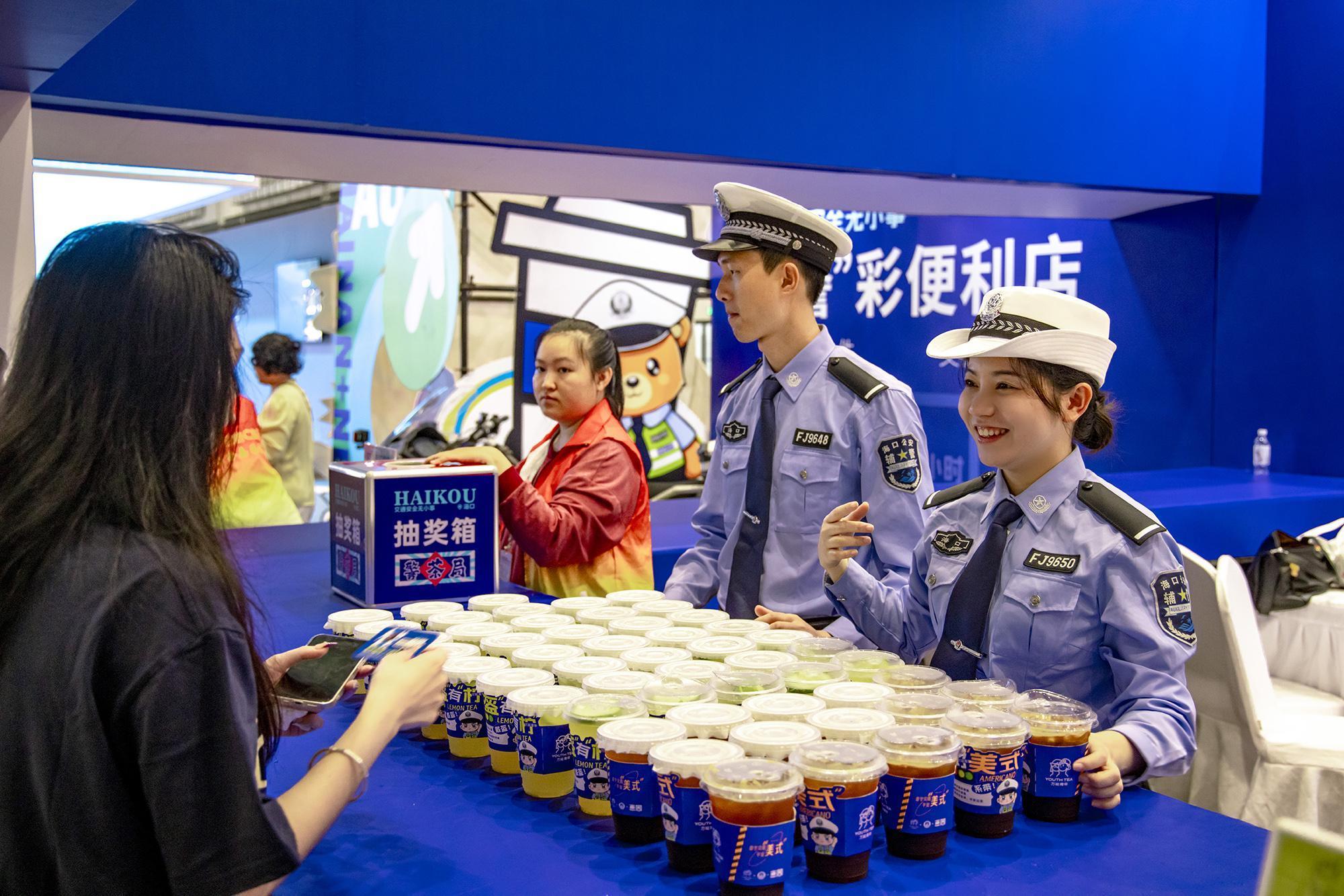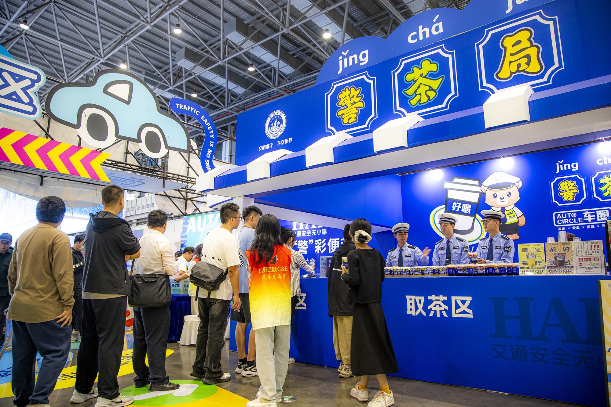走進1號展館,“警茶局”創(chuàng)意攤位前排起長龍。市民掃描二維碼參與“交通安全快測”答題,答對6題即可兌換限量特調(diào)飲品——清新檸檬茶“幸盔有檸”杯身印有醒目戴頭盔安全提示,咖啡特調(diào)“系好美式”以安全帶印制“系好安全帶,平安出發(fā)”標語,巧妙融合普法知識點。交警化身“茶飲師”為市民送上安全特調(diào)飲品,貼心叮囑出行安全事項,警民互動其樂融融。