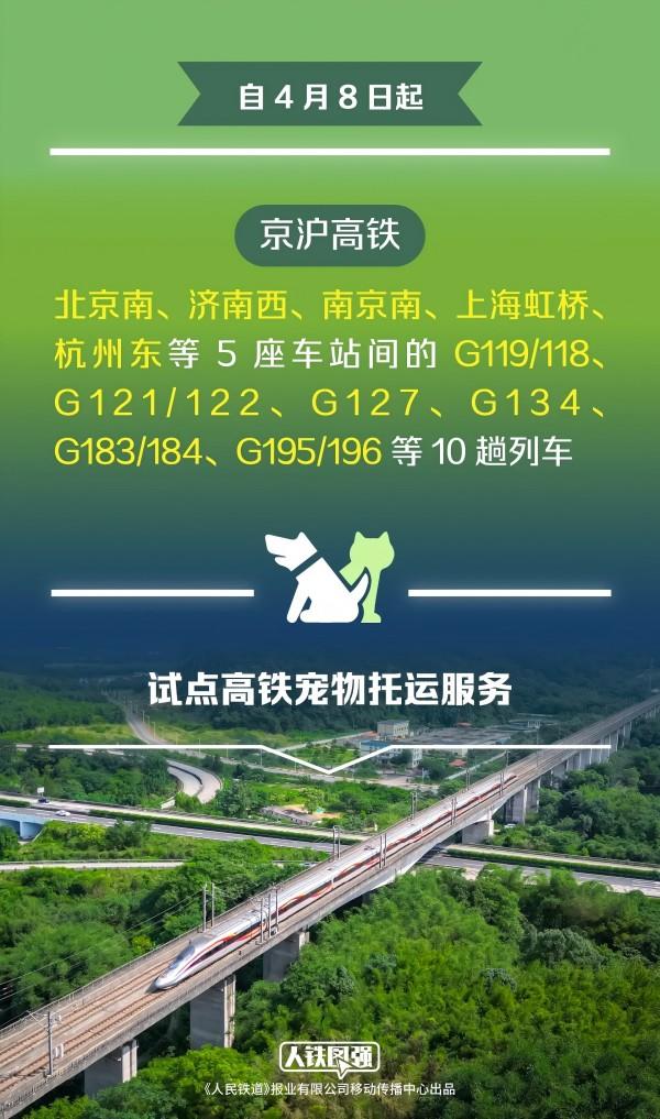 鐵路部門持續(xù)深化運(yùn)輸供給側(cè)結(jié)構(gòu)性改革,積極適應(yīng)廣大旅客多樣化的出行需求,在廣泛聽取旅客意見、深入開展市場(chǎng)調(diào)查基礎(chǔ)上,經(jīng)過(guò)專業(yè)測(cè)試評(píng)估,自4月8日起在京滬高鐵北京南、濟(jì)南西、南京南、上海虹橋、杭州東等5座車站間的G119/118、G121/122、G127、G134、G183/184、G195/196等10趟列車上試點(diǎn)高鐵寵物托運(yùn)服務(wù)。