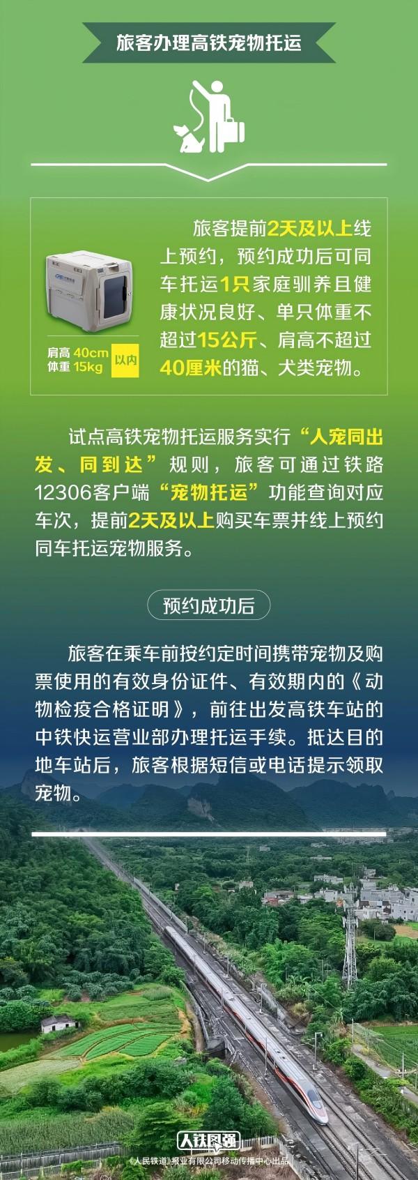 4月8日起,鐵路部門在京滬高鐵部分車次試點(diǎn)“隔離運(yùn)輸、人寵分開、專人看護(hù)”的高鐵寵物托運(yùn)服務(wù),鐵路12306同步推出“寵物托運(yùn)”功能,旅客提前2天及以上線上預(yù)約,預(yù)約成功后可同車托運(yùn)1只家庭馴養(yǎng)且健康狀況良好、單只體重不超過(guò)15公斤、肩高不超過(guò)40厘米的貓、犬類寵物。