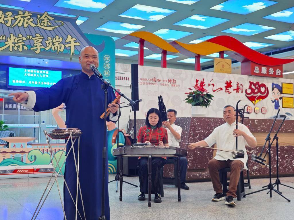 圖為在湖北武昌站演出的湖北大鼓《有意思》。(國鐵武漢局集團公司供圖)