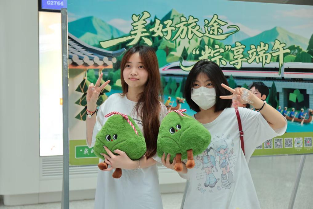 圖為贛州西站候車旅客在“美好旅途 ‘粽’享端午”背景板前打卡拍照。(國鐵南昌局集團公司供圖)