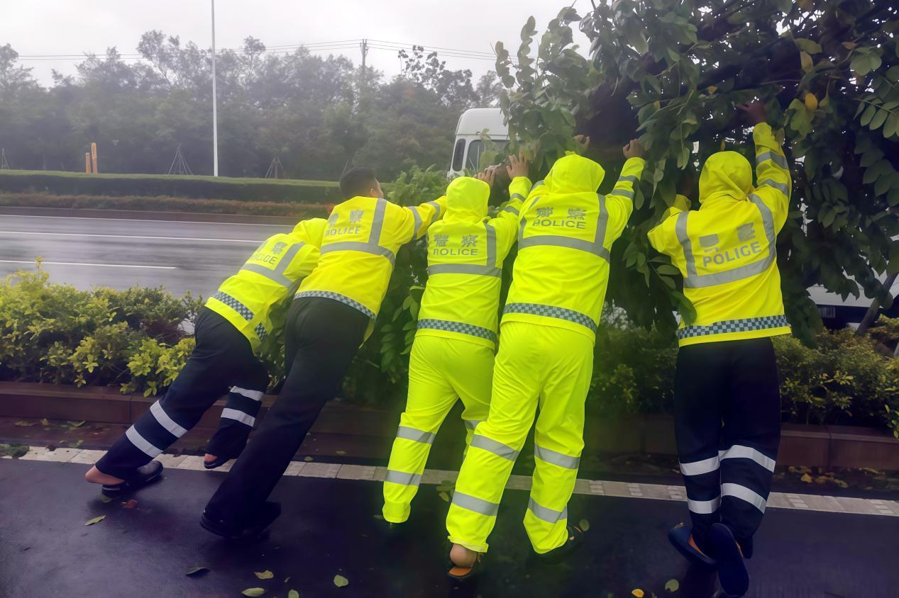 風(fēng)雨中,那一抹抹“熒光綠”格外醒目,扶正加固被吹倒的隔離護(hù)欄、徒手清理倒伏樹枝和路面雜物、及時疏通排水口確保道路暢通……暴雨模糊了視線,警笛穿透了風(fēng)聲,那抹熒光綠時而俯身搶險,時而挺立指揮,在白茫茫的雨幕中勾勒出最動人的剪影。