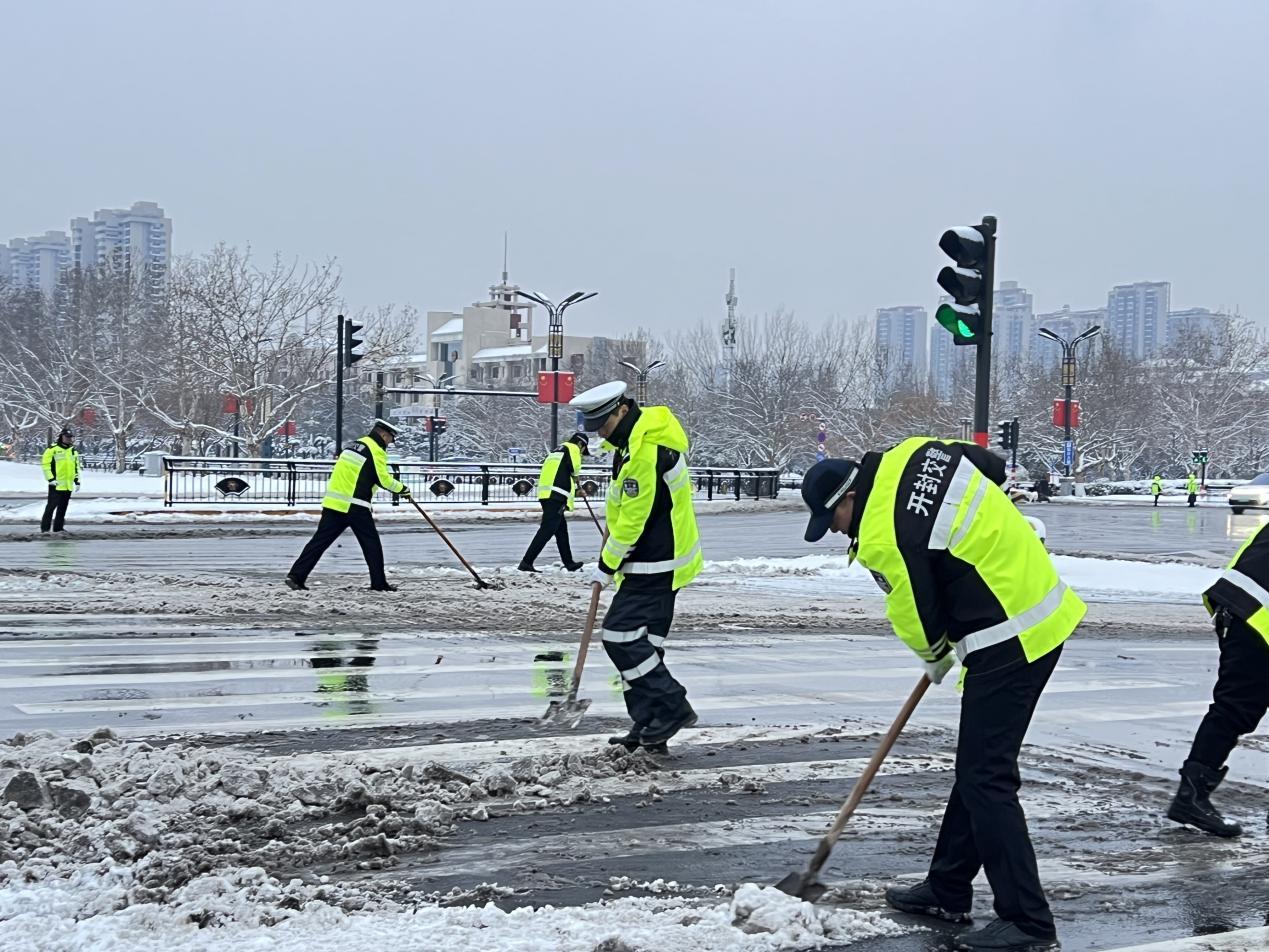 1月19日,河南省開封市遭遇大范圍強降雪天氣,道路積雪結(jié)冰給群眾出行帶來嚴峻考驗。面對惡劣天氣,開封市公安局交通管理支隊迅速啟動冰雪惡劣天氣交通應急處置預案,提前部署,強化指揮疏導和隱患排查,加強定點值守和巡邏管控,市、區(qū)、縣及高速各大隊以雪為令,聞雪而動,將警力最大限度部署在路面一線。從1月17日至1月20日,共出動警力3974人次,出動警車375輛次,設置執(zhí)勤點87處,救助群眾79人次,確保了全市道路安全、有序、暢通。