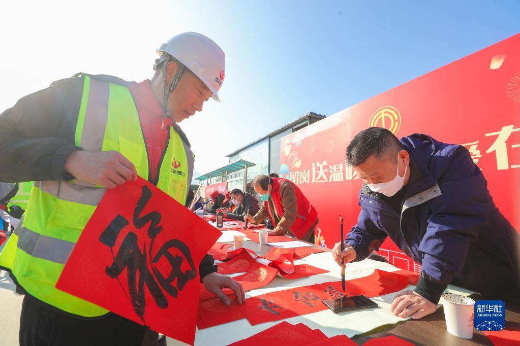 1月12日,在浙江省湖州市德清縣一處建設(shè)工地,書法愛好者為工友寫春聯(lián)和福字。新華社發(fā)(王正攝)