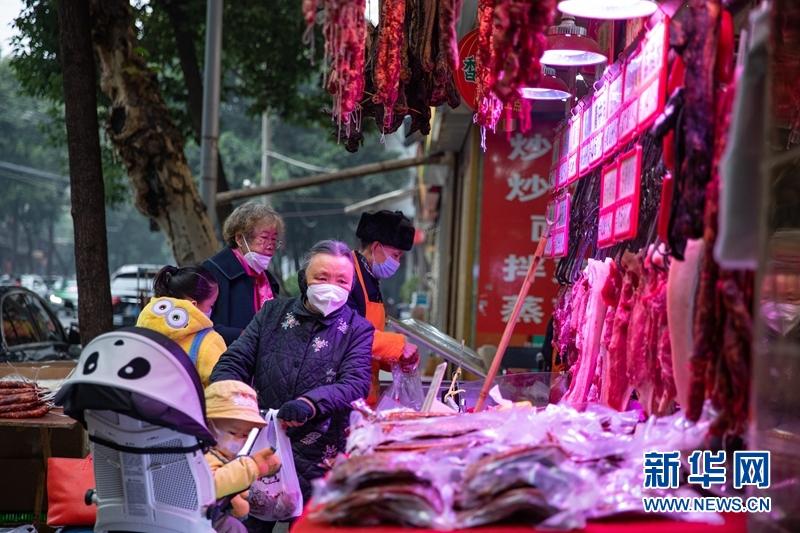 在成都市新開寺街,街道兩旁的肉鋪掛滿了香腸臘肉,市民在肉鋪前挑選香腸臘肉。