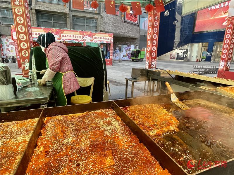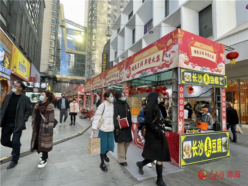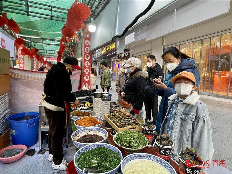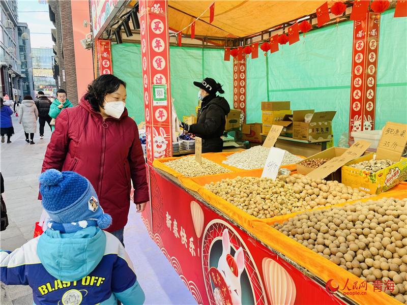力盟商業(yè)步行街是西寧市繁華熱鬧的街區(qū)之一,瓜子糖果、春聯(lián)燈籠、海鮮肉類(lèi)等年貨琳瑯滿(mǎn)目;糖葫蘆、臭豆腐、棉花糖等各色美食香氣撲鼻,市民聚集于此,體會(huì)濃濃年味,感受城市煙火氣。