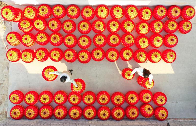 圖為兩名工人在擺放燈籠。(藁城區(qū)委宣傳部供圖)