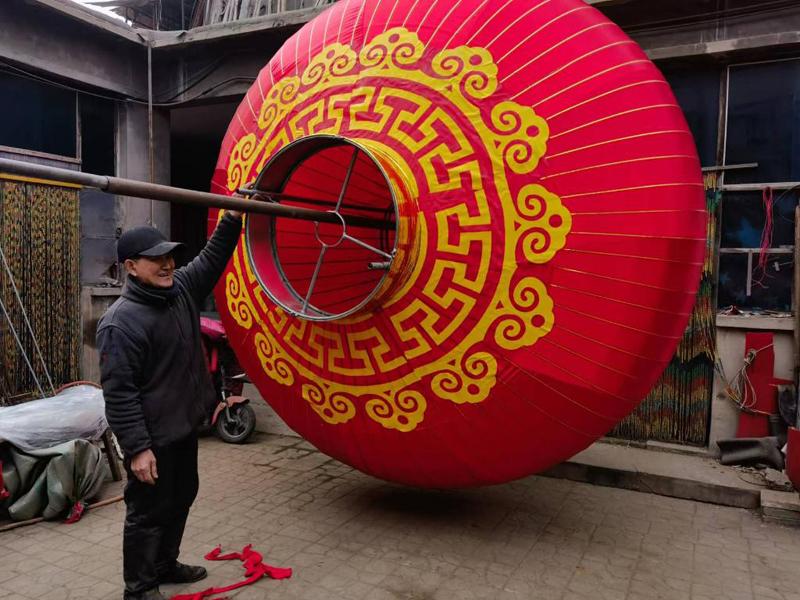 “這個(gè)規(guī)格是3米的,算是中等大小?!卑总娖绞炀毜?fù)伍_了一個(gè)大紅燈籠。打小跟老人學(xué)燈籠技藝,白軍平最擅長(zhǎng)制作各種規(guī)格的大燈籠。