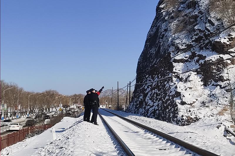 大風(fēng)天承接雨雪天,京承鐵路線上,呼嘯的寒風(fēng)吹起地面積雪,雪沫拍打在臉上冰涼刺骨。承德站派出所所長會亞君帶領(lǐng)民警來到線路的一處山體旁,“雨雪天開展線路督導(dǎo)檢查,要確保線路設(shè)備設(shè)施運(yùn)轉(zhuǎn)正常,還要防止周圍山體松動,落石影響行車”,會亞君告訴記者,在雪地里踏著石渣行進(jìn)很慢,一兩個小時身上就開始出汗,山風(fēng)一吹就更冷了。