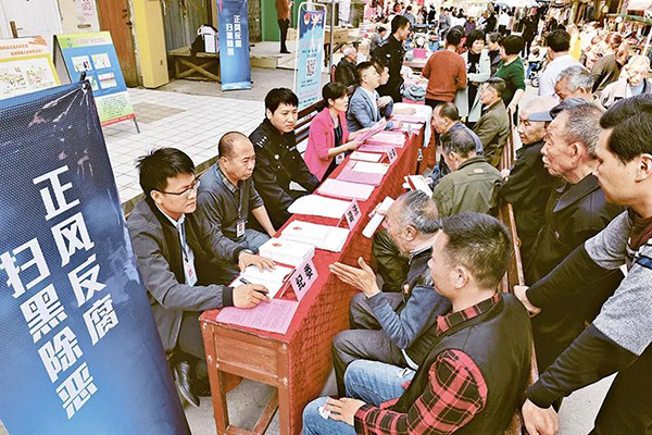 部署開展掃黑除惡專項(xiàng)斗爭,社會(huì)治安秩序明顯改善,基層治理成效顯著。圖為在掃黑除惡斗爭中,福建省建甌市接訪工作人員在小橋鎮(zhèn)墟日上接待群眾來訪。新華社記者張國俊/攝
