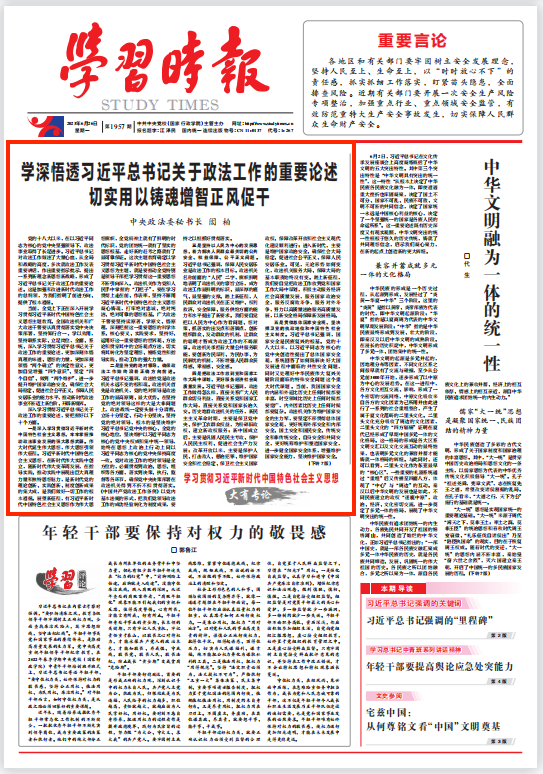 當前,全黨上下正在深入開展學習貫徹習近平新時代中國特色社會主義思想主題教育。全國政法機關和廣大政法干警要認真貫徹落實黨中央決策部署,堅持知行合一、學以致用,堅持聯(lián)系實際、立足崗位,全面、系統(tǒng)、深入學習貫徹習近平總書記關于政法工作的重要論述,更加深刻體悟真理的味道、思想的力量,更加深刻領悟“兩個確立”的決定性意義,更加自覺增強“四個意識”、堅定“四個自信”、做到“兩個維護”,進一步提升維護國家政治安全、確保社會大局穩(wěn)定、促進社會公平正義、保障人民安居樂業(yè)的能力水平,推動新時代政法事業(yè)不斷邁上新臺階、開辟新境界。