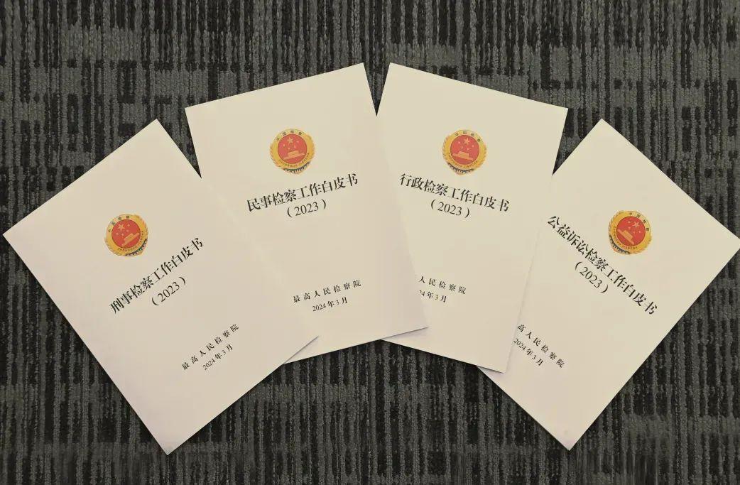 圖為2024年3月9日最高人民檢察院發(fā)布的2023年“四大檢察”工作白皮書。白皮書按照刑事、民事、行政、公益訴訟檢察四個(gè)條線,全方位呈現(xiàn)2023年檢察工作新進(jìn)展新成效。最高人民檢察院供圖