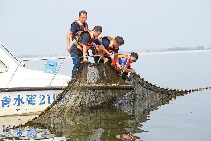 長(zhǎng)江十年禁漁計(jì)劃從2020年1月1日0時(shí)起開始實(shí)施。江西省共青城公安局啟動(dòng)“長(zhǎng)江流域非法捕撈首輪同步巡查執(zhí)法行動(dòng)”,嚴(yán)厲打擊非法捕撈違法犯罪行為。圖為2020年8月25日,共青城公安局民警對(duì)新發(fā)現(xiàn)的非法捕撈“迷魂陣”進(jìn)行處理。 公安部供圖