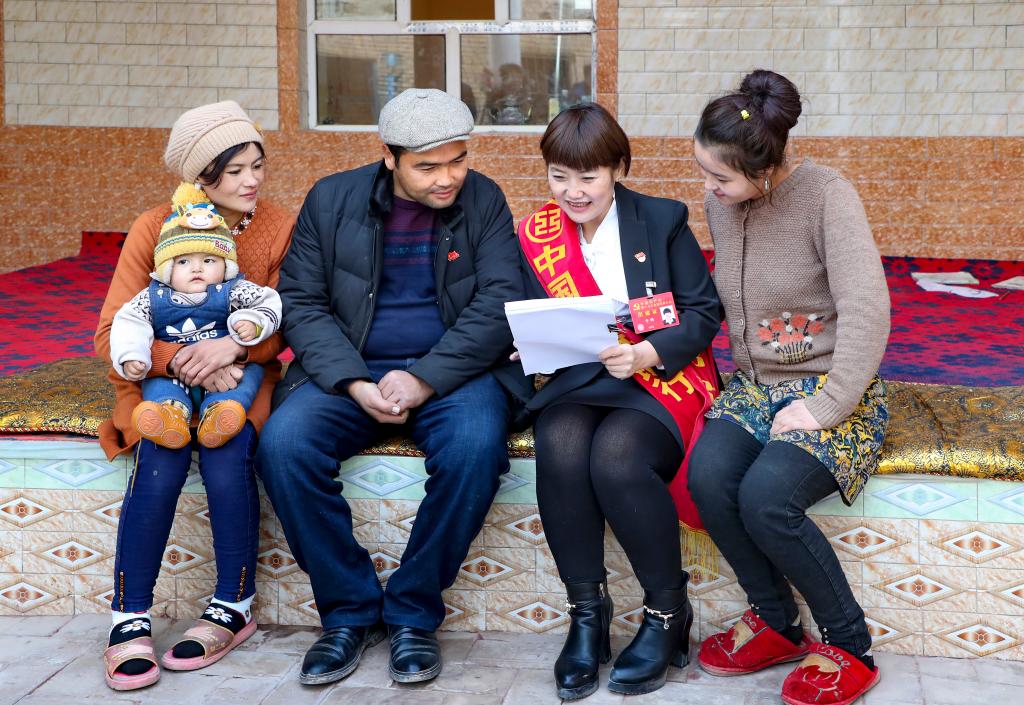 李鵬在新疆喀什地區(qū)疏勒縣塔尕爾其鄉(xiāng)塔尕爾其村向村民進(jìn)行理論宣傳(2017年12月攝)。新華社發(fā)