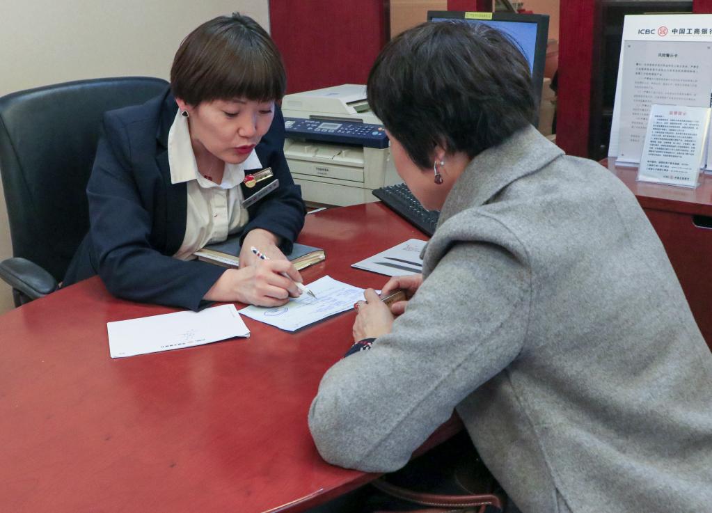 在中國工商銀行新疆烏魯木齊的一處營業(yè)網(wǎng)點(diǎn),李鵬(左)為客戶解答問題(2018年11月攝)。新華社發(fā)