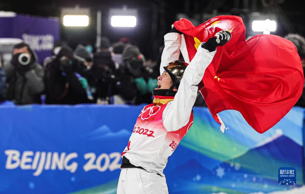 徐夢桃在張家口云頂滑雪公園舉行的北京2022年冬奧會自由式滑雪女子空中技巧決賽奪冠后慶祝(2022年2月14日攝)。新華社記者 吳壯 攝