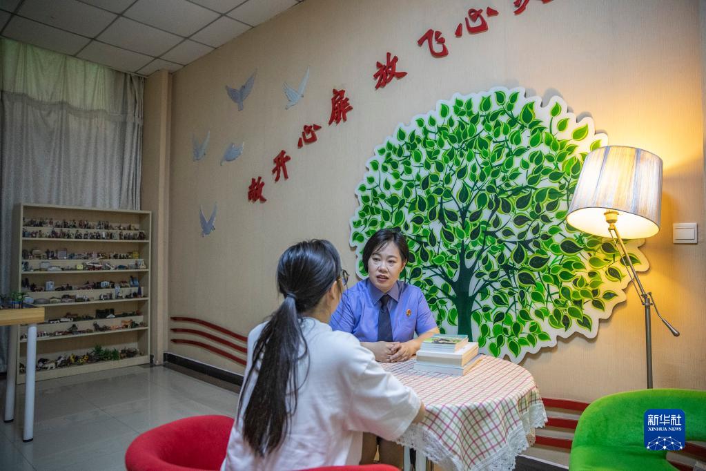 9月20日,在重慶市大渡口區(qū)人民檢察院“莎姐”談心室內(nèi),梅玫與一名前來(lái)咨詢(xún)的未成年人談心。新華社記者 黃偉 攝