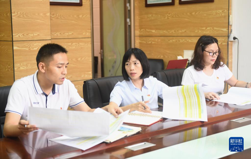 陸秀興(中)與佛山市禪城區(qū)張槎街道古灶村“兩委”班子同事開會(huì)交流(2022年9月7日攝)。新華社記者 盧漢欣 攝