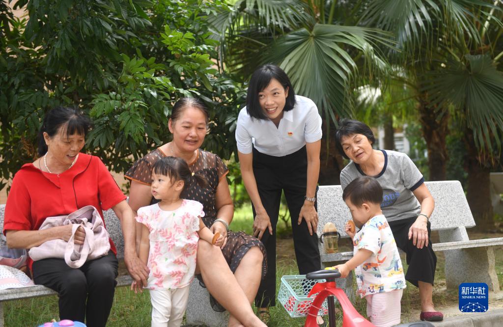陸秀興(右三)和佛山市禪城區(qū)張槎街道古灶村村民在一起聊天(2022年9月7日攝)。新華社記者 盧漢欣 攝