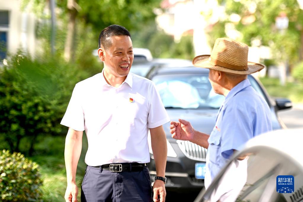 在浙江省寧波市奉化區(qū)蕭王廟街道滕頭村,傅平均(左)入戶走訪村民,聽取意見和建議(9月16日攝)。新華社記者 黃宗治 攝
