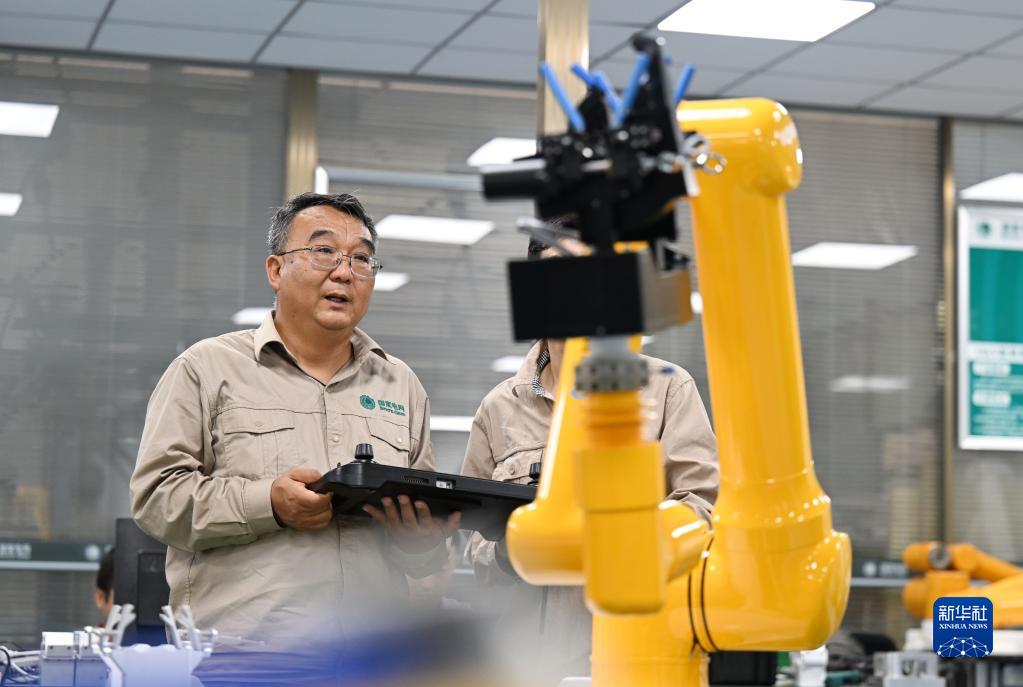 張黎明和同事在調試第四代配網帶電作業(yè)機器人(2022年9月8日攝)。新華社記者 趙子碩 攝