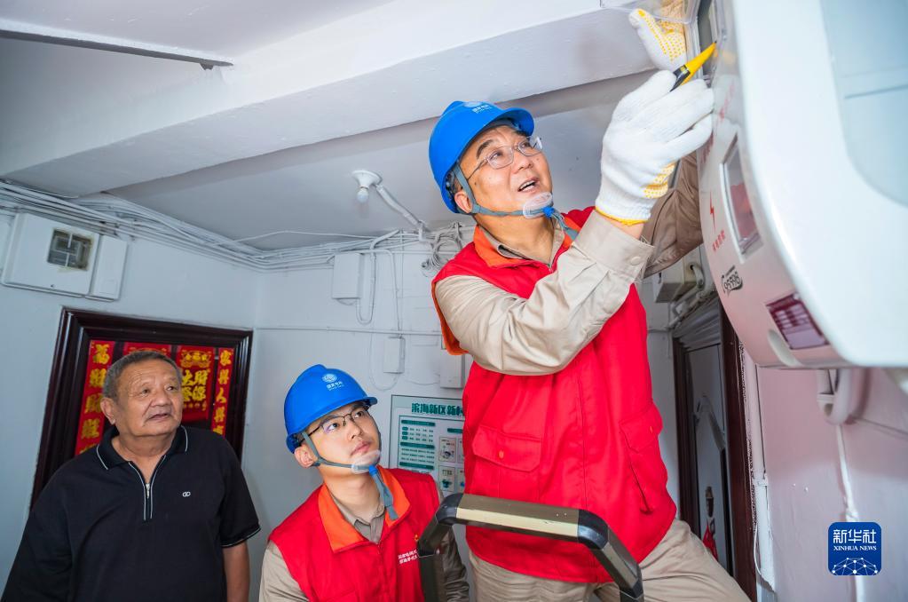 張黎明(右)帶領國網天津濱海黎明共產黨員服務隊到天津市濱海新區(qū)丹東里小區(qū)為居民查看電表(2022年7月15日攝)。新華社發(fā)(李津攝)