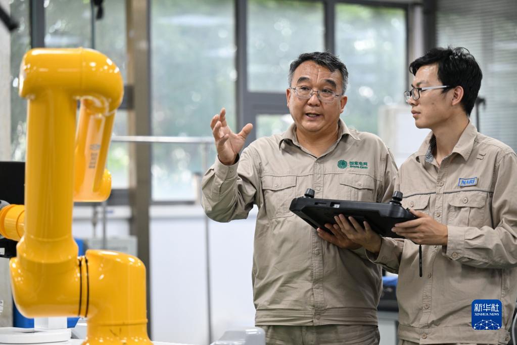 張黎明(左)和同事在調試第四代配網帶電作業(yè)機器人(2022年9月8日攝)。新華社記者 趙子碩 攝