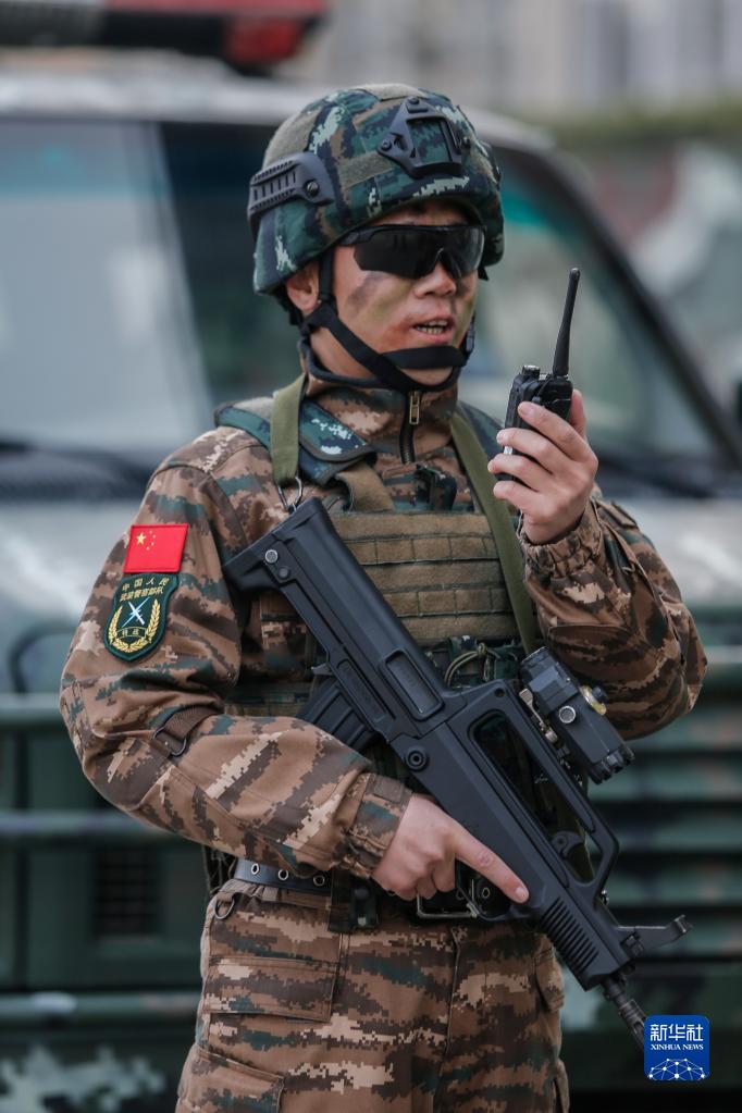 武警河北總隊(duì)某部大隊(duì)長李闖在演練中下達(dá)任務(wù)指令(2021年3月4日攝)。新華社發(fā)(張丹 攝)