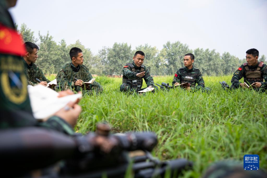 武警河北總隊(duì)某部大隊(duì)長李闖(右三)和特戰(zhàn)隊(duì)員進(jìn)行理論研討(2022年8月3日攝)。新華社發(fā)(江騰 攝)