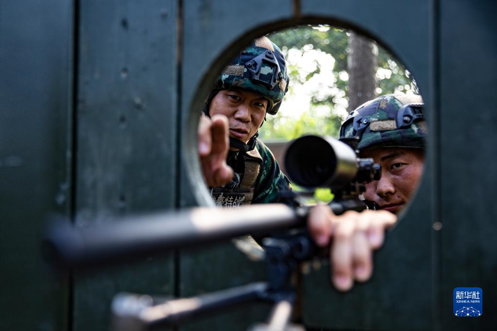 武警河北總隊(duì)某部大隊(duì)長李闖(左)指導(dǎo)特戰(zhàn)隊(duì)員狙擊訓(xùn)練(2022年8月3日攝)。新華社發(fā)(江騰 攝)