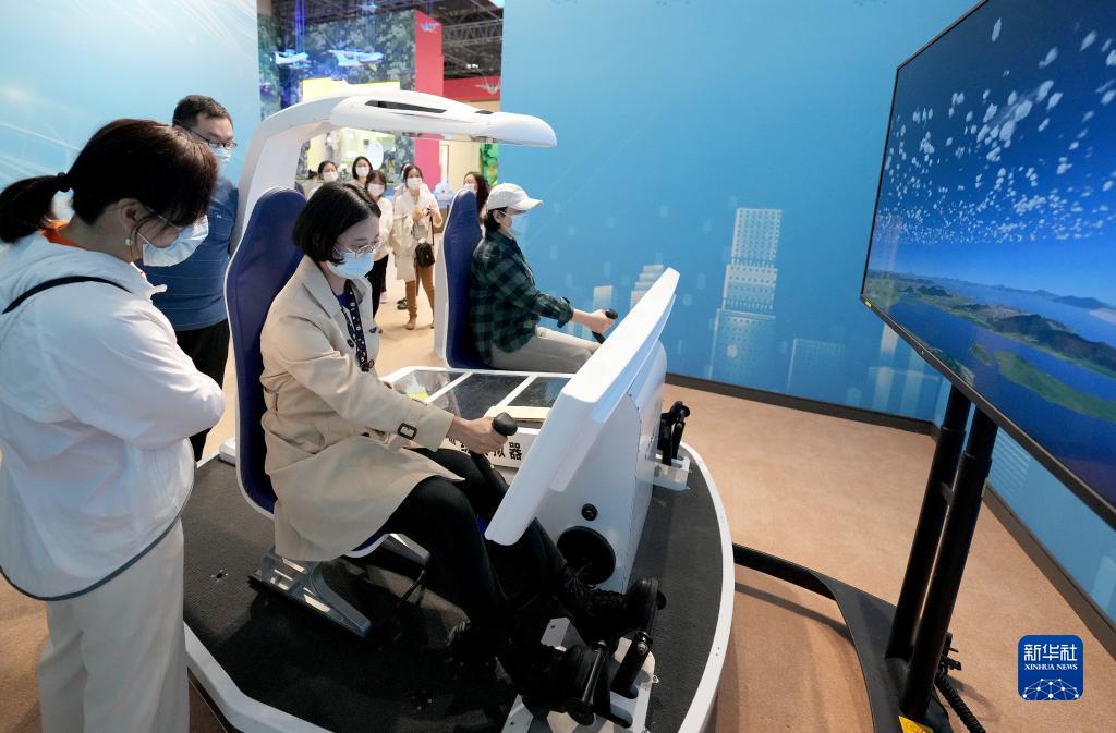 10月7日,觀眾在“奮進新時代”主題成就展上體驗操縱直升機訓(xùn)練模擬器。