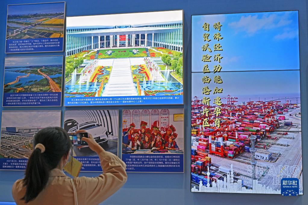 10月8日,一名觀眾在上海展區(qū)拍攝進(jìn)博會(huì)主會(huì)場(chǎng)的宣傳圖。新華社記者 李鑫 攝