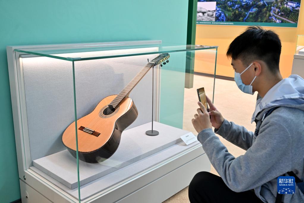 10月8日,一名觀眾在貴州展區(qū)拍攝正安吉他。貴州省正安縣目前已成為全球最大吉他生產(chǎn)基地,已帶動(dòng)近15000人在家門口就業(yè)、6000余人穩(wěn)定脫貧。新華社記者 李鑫 攝
