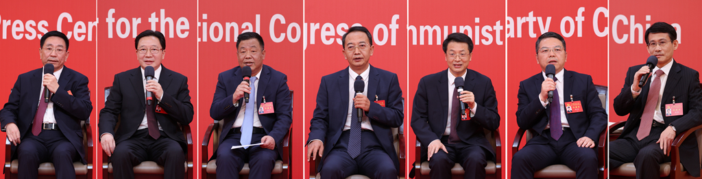 10月19日,中國(guó)共產(chǎn)黨第二十次全國(guó)代表大會(huì)新聞中心舉行集體采訪(fǎng)。山東、河南、湖北、湖南、廣東、廣西、海南代表團(tuán)新聞發(fā)言人出席,介紹代表團(tuán)學(xué)習(xí)討論二十大報(bào)告情況,并回答記者提問(wèn)(拼版照片)。