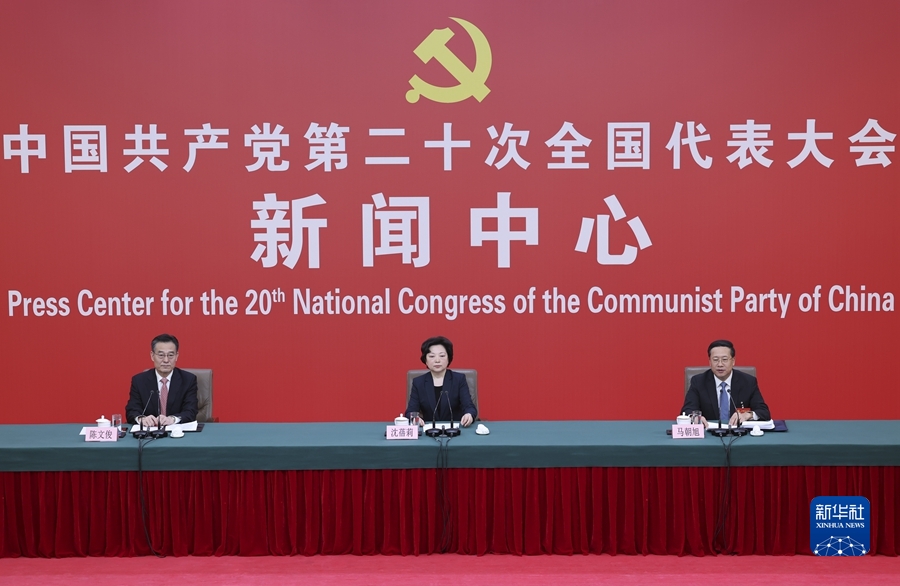 10月20日,中國(guó)共產(chǎn)黨第二十次全國(guó)代表大會(huì)新聞中心舉行記者招待會(huì)。中央對(duì)外聯(lián)絡(luò)部副部長(zhǎng)沈蓓莉,外交部黨委委員、副部長(zhǎng)馬朝旭圍繞“習(xí)近平外交思想指引中國(guó)特色大國(guó)外交開(kāi)拓前行”主題與記者交流。新華社記者 陳建力 攝