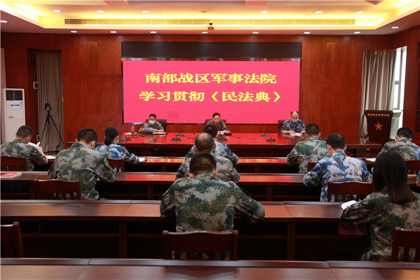 南部戰(zhàn)區(qū)軍事法院召開專題黨委會,認真學習習近平主席在中央政治局第二十次集體學習時的重要講話、全國法院學習貫徹2020年全國兩會精神視頻會議精神和民法典,專題部署推動戰(zhàn)區(qū)兩級軍事法院和轄區(qū)部隊民法典學習宣傳貫徹工作,要求戰(zhàn)區(qū)兩級軍事法院在學習宣傳貫徹民法典中走在前列,為部隊和官兵樹好標桿;準確理解和把握民法典立法精神、條文含義和最新內容,提高運用民法典維護官兵權益、化解矛盾糾紛、促進部隊和社會和諧穩(wěn)定的能力;把深入宣傳貫徹民法典作為當前和今后一個時期的工作重點,在戰(zhàn)區(qū)部隊營造尊法學法守法用法的濃厚氛圍。