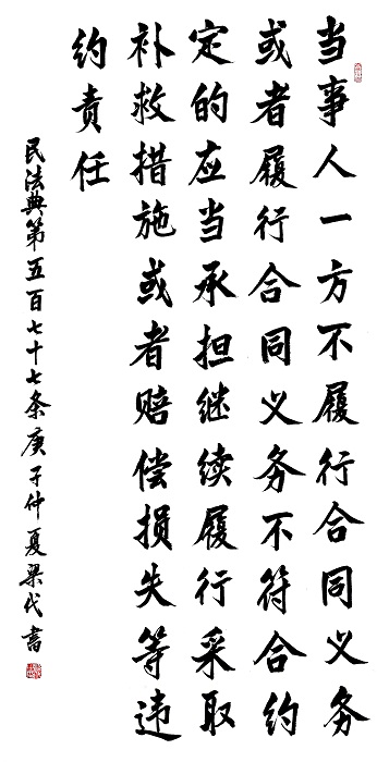民法典第五百七十七條 當(dāng)事人一方不履行合同義務(wù)或者履行合同義務(wù)不符合約定的,應(yīng)當(dāng)承擔(dān)繼續(xù)履行、采取補(bǔ)救措施或者賠償損失等違約責(zé)任。