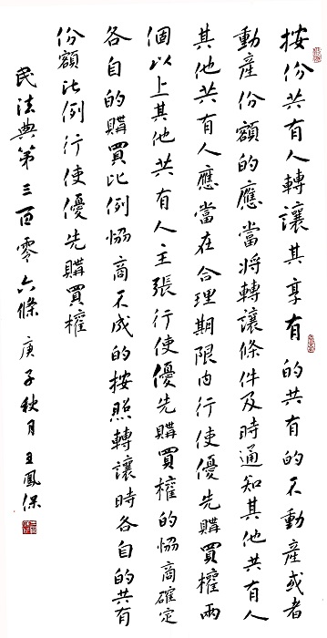 民法典第三百零六條 按份共有人轉(zhuǎn)讓其享有的共有的不動(dòng)產(chǎn)或者動(dòng)產(chǎn)份額的,應(yīng)當(dāng)將轉(zhuǎn)讓條件及時(shí)通知其他共有人。其他共有人應(yīng)當(dāng)在合理期限內(nèi)行使優(yōu)先購(gòu)買權(quán)。