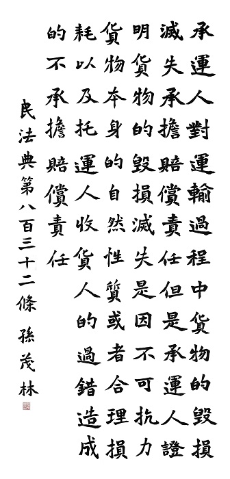 民法典第八百三十二條 承運(yùn)人對(duì)運(yùn)輸過(guò)程中貨物的毀損、滅失承擔(dān)賠償責(zé)任。但是,承運(yùn)人證明貨物的毀損、滅失是因不可抗力、貨物本身的自然性質(zhì)或者合理?yè)p耗以及托運(yùn)人、收貨人的過(guò)錯(cuò)造成的,不承擔(dān)賠償責(zé)任。