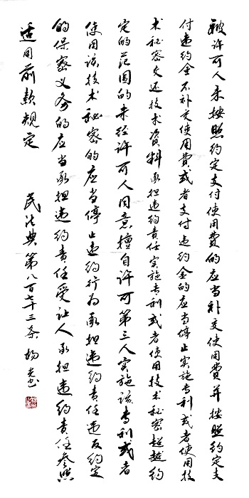 民法典第八百七十三條 被許可人未按照約定支付使用費(fèi)的,應(yīng)當(dāng)補(bǔ)交使用費(fèi)并按照約定支付違約金;不補(bǔ)交使用費(fèi)或者支付違約金的,應(yīng)當(dāng)停止實(shí)施專利或者使用技術(shù)秘密,交還技術(shù)資料,承擔(dān)違約責(zé)任;實(shí)施專利或者使用技術(shù)秘密超越約定的范圍的,未經(jīng)許可人同意擅自許可第三人實(shí)施該專利或者使用該技術(shù)秘密的,應(yīng)當(dāng)停止違約行為,承擔(dān)違約責(zé)任;違反約定的保密義務(wù)的,應(yīng)當(dāng)承擔(dān)違約責(zé)任。