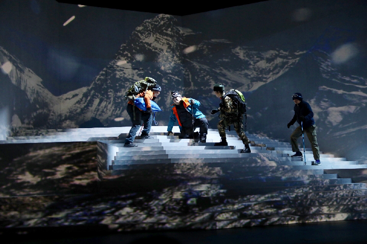 舞臺(tái)上,話劇《種子天堂》劇情進(jìn)入最高潮——在缺氧、強(qiáng)風(fēng)惡劣環(huán)境下,鐘揚(yáng)拼盡氣力來(lái)到海拔6000米的高度。當(dāng)他終于在一堆雜草和冰雪中發(fā)現(xiàn)那株頑強(qiáng)的雪蓮時(shí),就像父親看到自己剛出生的嬰兒,臉上掛著深深的喜悅,凝望良久……