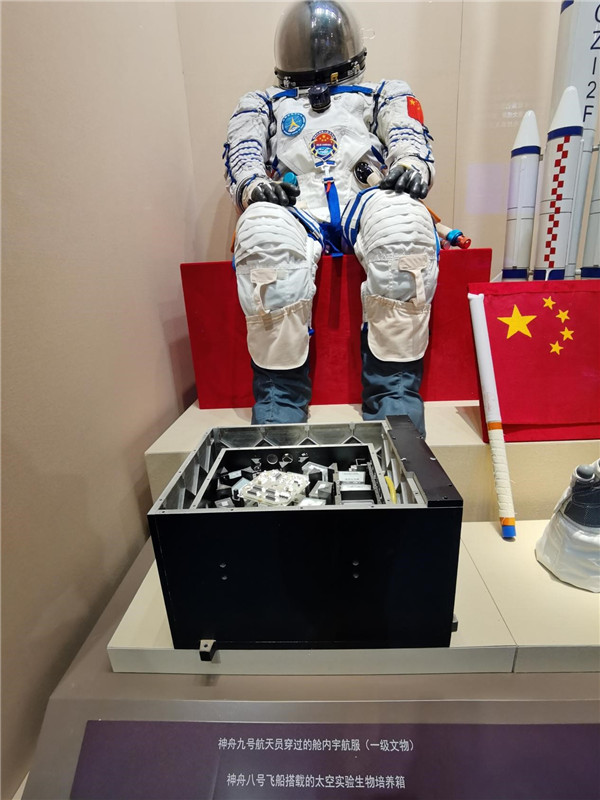 神舟九號航天員穿過的艙內(nèi)宇航服;神舟八號飛船搭載的太空實驗生物培養(yǎng)箱。