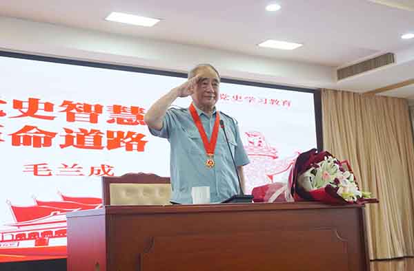 銘記革命歷史,傳承紅色基因。“中國(guó)好人”、空軍老戰(zhàn)士報(bào)告團(tuán)、洪山區(qū)“五老”報(bào)告團(tuán)團(tuán)長(zhǎng)毛蘭成在大會(huì)上以《汲取黨史智慧 走好革命道路》為題為全體黨員作報(bào)告。