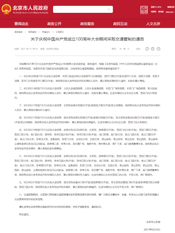 原標(biāo)題:關(guān)于慶祝中國(guó)共產(chǎn)黨成立100周年大會(huì)期間采取交通管制的通告